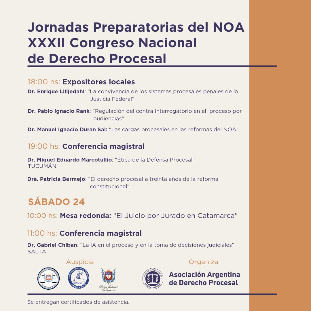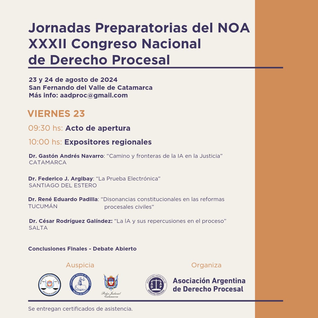 Los esperamos a participar en una nueva jornada preparatoria del XXXII Congreso Nacional de Derecho Procesal, los días 23 y 24 de agosto en Catamarca.